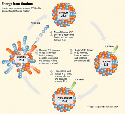 Thorium has some advantages over uranium: it is more abundant; it produces less toxic waste products, and its by-products cannot be used in weapons. Thorium reactors can also burn up existing nuclear waste.